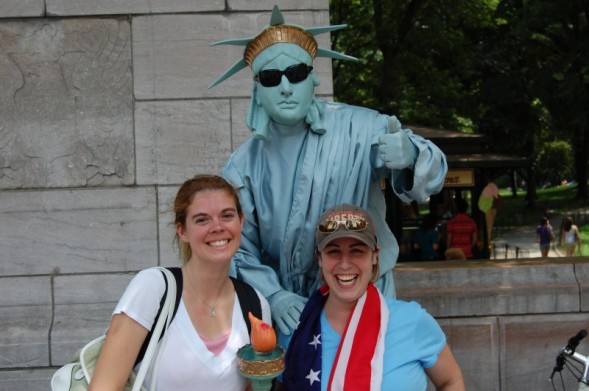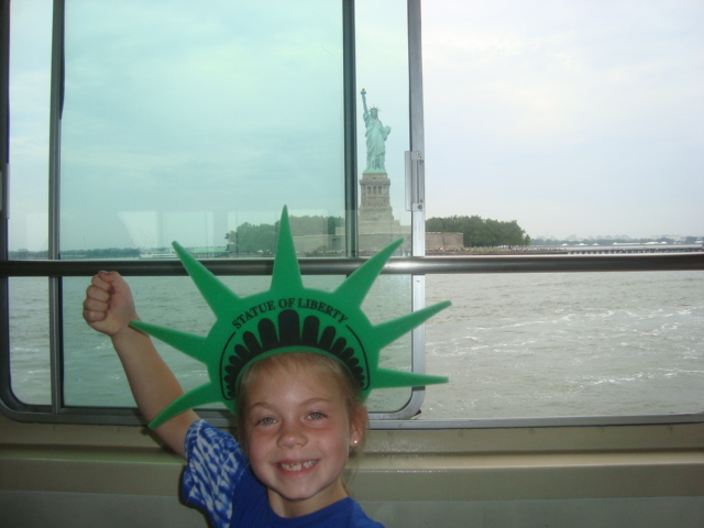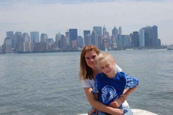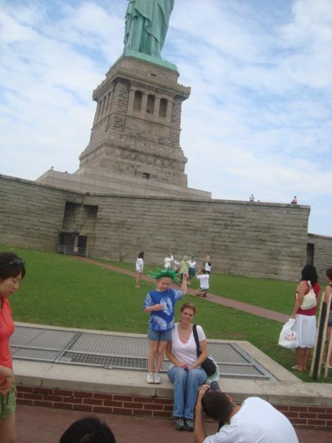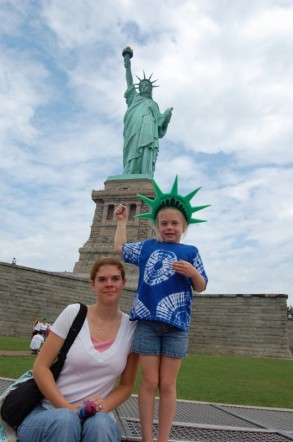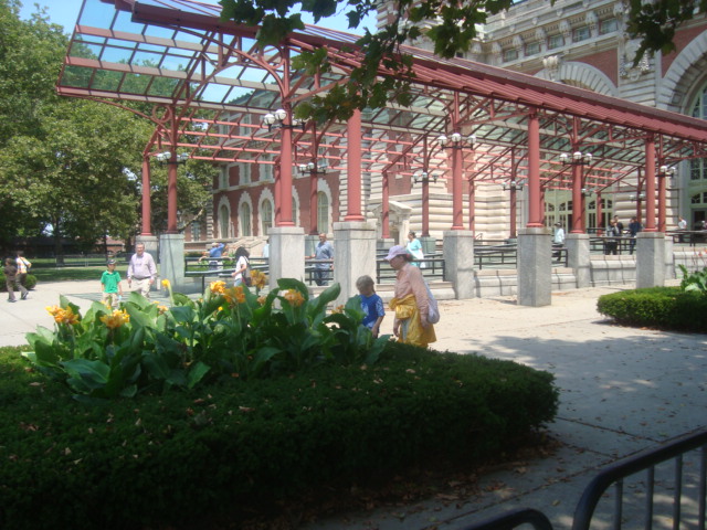 Mary and Allie admire the flowers at the entrance to Ellis Island.